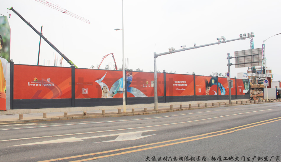 此工地施工工程采用了深圳市大通建材有限公司生產批發的施工現標準工地大門+A類烤漆鋼結構裝配式圍擋+圍擋節能燈+圍擋基礎等產品
