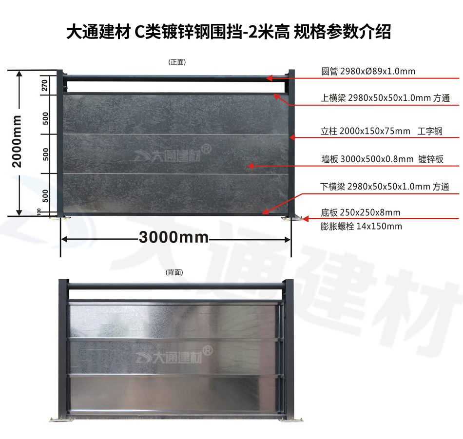 深圳大通建材 C類裝配式鋼結構圍擋-鍍鋅板款 通常作為圍墻護欄使用,起隔離防護作用。常規一擋的長度是3米、高度是2.5米,適合對圍擋高度要求至少要2.5米高的工程項目選用