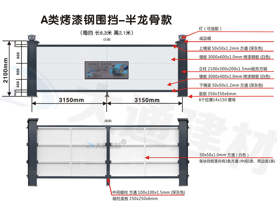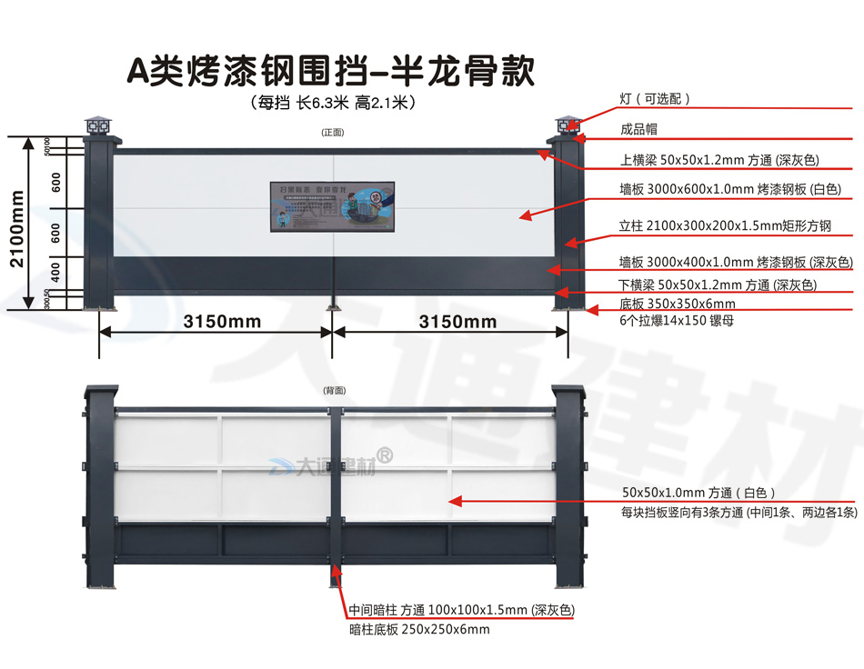 深圳市大通建材A類鋼圍擋烤漆半龍骨款的標準高度是2.5米、長度為6.3米一擋,而圍擋高度特殊需求的如2.1米/3米/4米/5米/6米等高度的可以進行定制化生產。